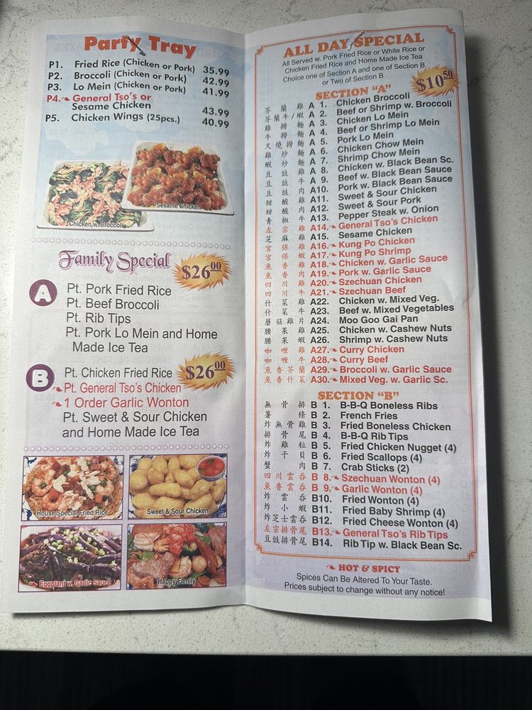 1 pint of: chicken fried rice, general tso's chicken, sweet and sour chicken, and 1 order of garlic Wonton (spicy). Served with homemade iced tea.