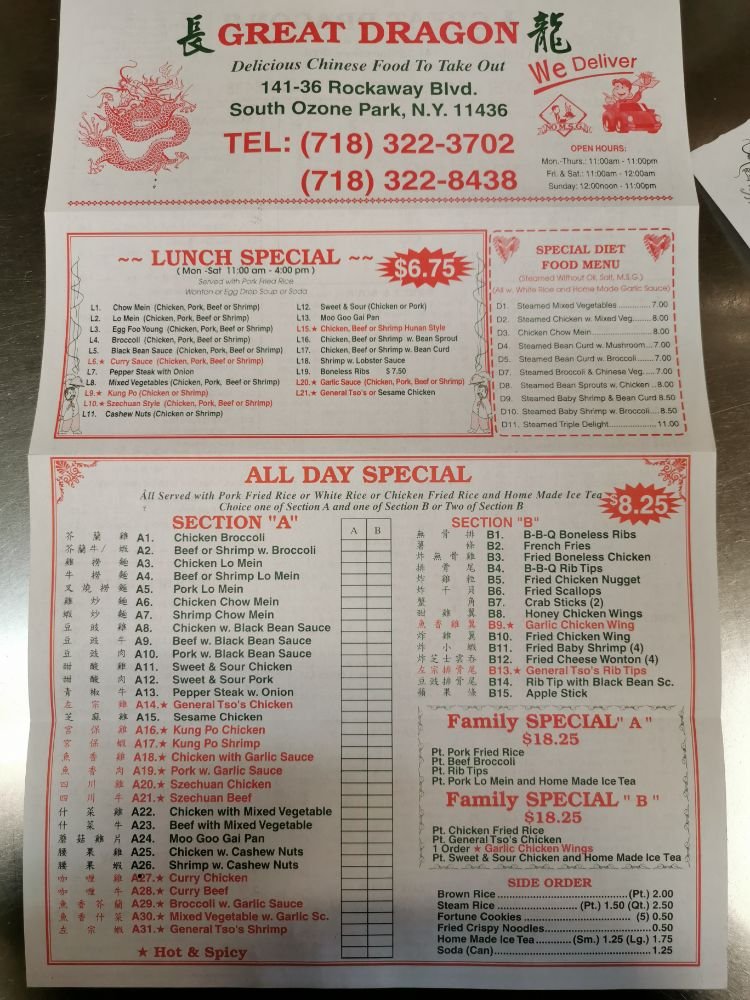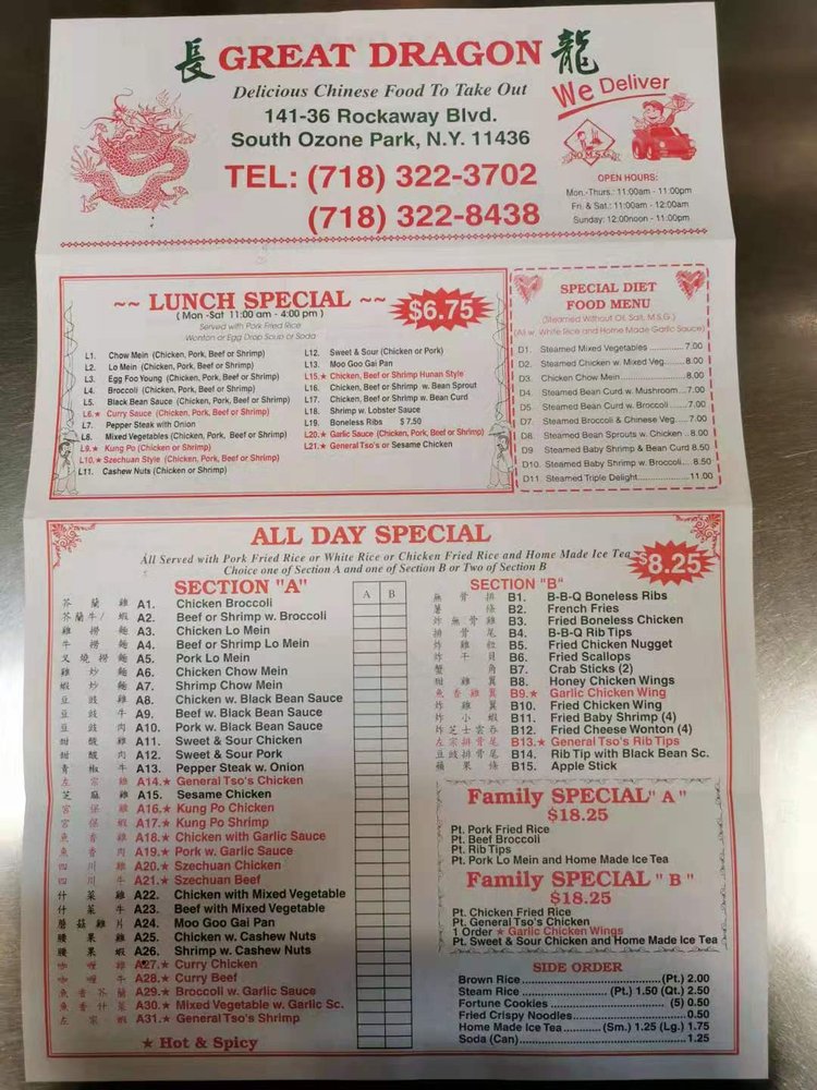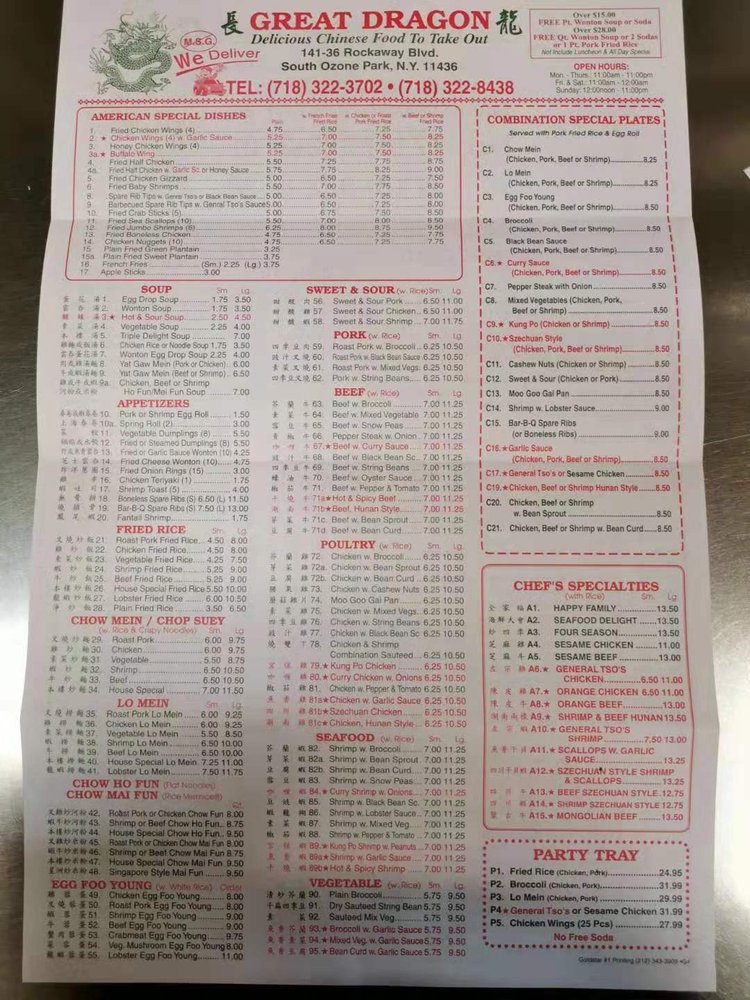 Introducing Great Dragon, a delightful gem in New York that serves authentic Chinese cuisine. Located at 141-36 Rockaway Blvd, this cozy restaurant is perfect for families and groups, with options for delivery, takeout, and dining in. The atmosphere is relaxed, making it an ideal spot for a quick bite or a leisurely meal.